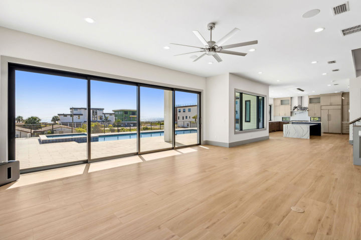Step inside to the main level, an open and airy space perfect for entertaining. A seamless floor plan flows effortlessly from kitchen to living and dining, anchored by expansive sliding glass doors that frame breathtaking views of the pool and ocean beyond. Natural light pours in through large windows, creating a space that feels both tranquil and vibrant.