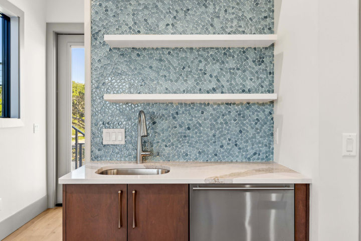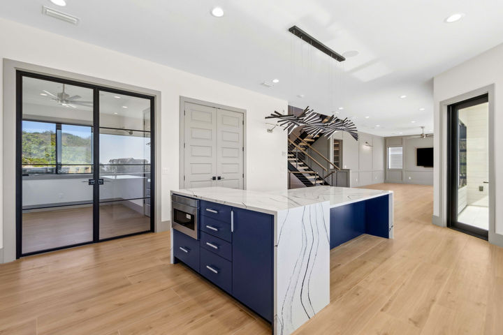 The color palette draws from the surrounding landscape—ocean blues, sandy neutrals, and lush greens—all brought to life through custom selections like the striking Birds of Paradise wallpaper. The main level also includes a thoughtfully designed guest suite complete with a wet bar, creating the ultimate retreat for visitors who want to soak up the vacation vibes.
